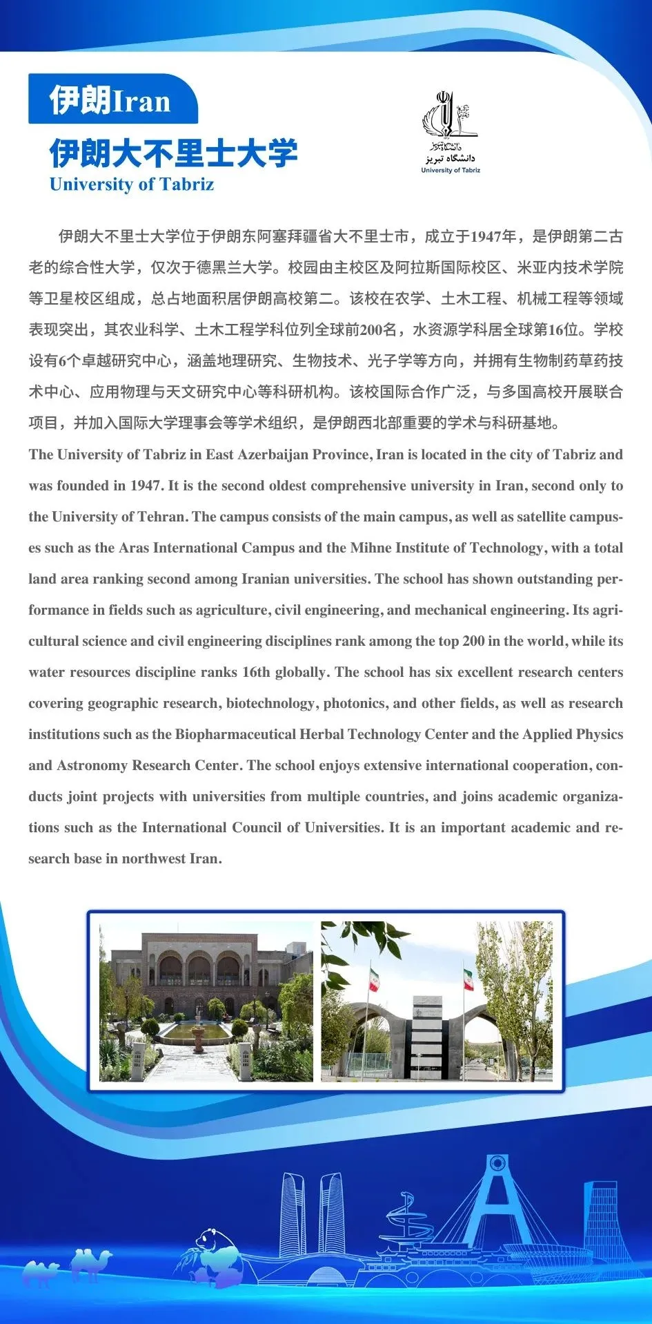 高校科研,创新之源! 本期聚焦三所国际知名高校合作需求 伊朗大不里士大学 (全球水资源第16,农学、工程前200) 寻求国际科研合作 土耳其梅尔辛大学 (技术开发区Technoscope促进产学结合) 期待技术交流 希腊国际希腊大学 (IHU,全英授课,可持续发展研究所) 致力于推动国际合作 连接全球学术力量 共促技术转移与人才培养